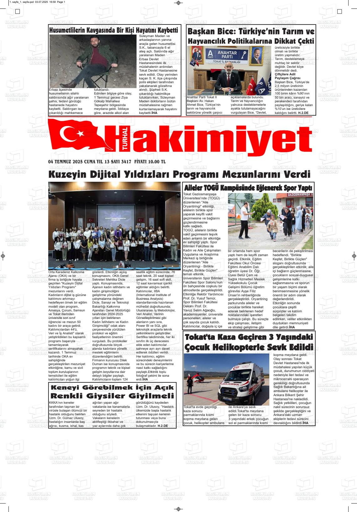 Tokat Yerel Gazeteleri 20 Ekim 2025, Pazartesi Günü Manşeti